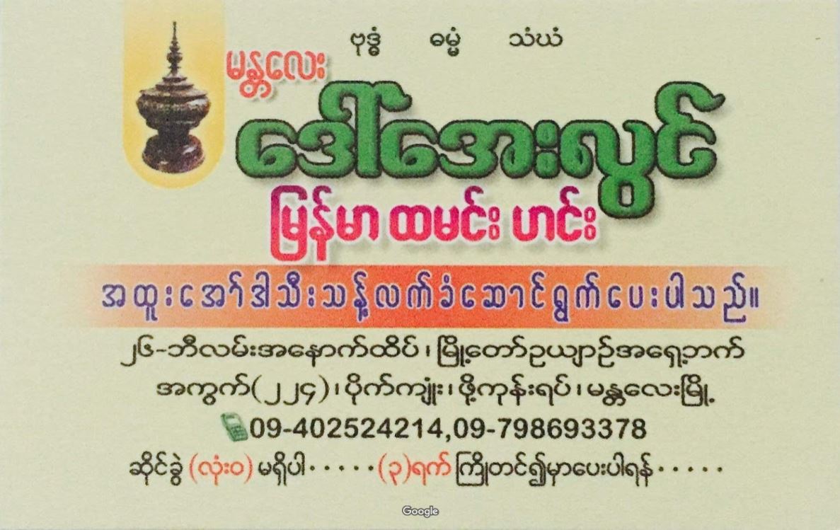 : အကွက်(၂၂၄)၊ ၂၆(ဘီ)လမ်းအနောက်ထိပ်၊ မြို့တော်ဥယျာဉ်အရှေ့ဘက်၊ ပိုက်ကျုံး၊ ဖို့ကုန်းရပ်၊ သီရိဟေမာအနောက်ရပ်ကွက်၊ ချမ်းအေးသာစံမြို့နယ်၊ မန္တလေး။
