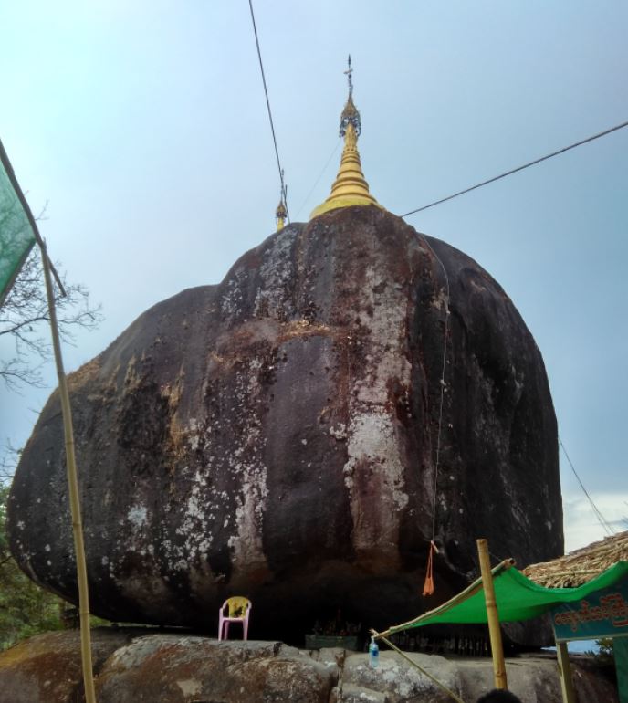 မွန်ပြည်နယ်၊ ကျိုက်ထိုမြို့နယ်၊ ကျိုက်ထီးရိုးတောင်၏မြောက်ဘက် ၂ မိုင်ခွဲခန့်အကွာတွင် တည်ရှိပါသည်။ ပေနှစ်ဆယ်ခန့်ကျယ်သော ကျောက်ဖျာကြီး နှစ်ချပ်ပေါ်တွင် စေတီနှစ်ဆူ တည်ထားခြင်းဖြစ်ပါသည်။ သမိုင်းရာဇဝင်အရ ရဟန္တာနှစ်ပါးက တည်ထားပူဇော်ခဲ့သည်ဟု သိရပါသည်။ စေတီရင်ပြင်တော်သို့ တက်ရောက်ရန် လှေကားမရှိဘဲ စေတီတော်ကို တောင်မကြီး၏ ကျောက်စွန်းတစ်ခုနှင့် ကိုက်တစ်ရာခန့်ရှိသော ကြိမ်ကြိုးတစ်ချောင်းဖြင့် သွယ်တန်းထားသည်။ ထူးခြားချက်အနေဖြင့် ရွှေသင်္ကန်းကပ်လှူပူဇော်လိုသူများသည် ရွှေဆိုင်းများကို ကြိုးဝိဇ္ဇာထံသို့ပေးပို့ပြီး ကြိုးဝိဇ္ဇာက ယင်းကြိမ်ကြိုးတစ်ချောင်းတည်းပေါ်တွင် ကြိုးကိုလက်နှစ်ဖက်ဖြင့်လွှဲကာ စေတီတော်ရင်ပြင်သို့အရောက်သွားပြီး ရွှေသင်္ကန်းကပ်လှူပူဇော်ပေးပါသည်။