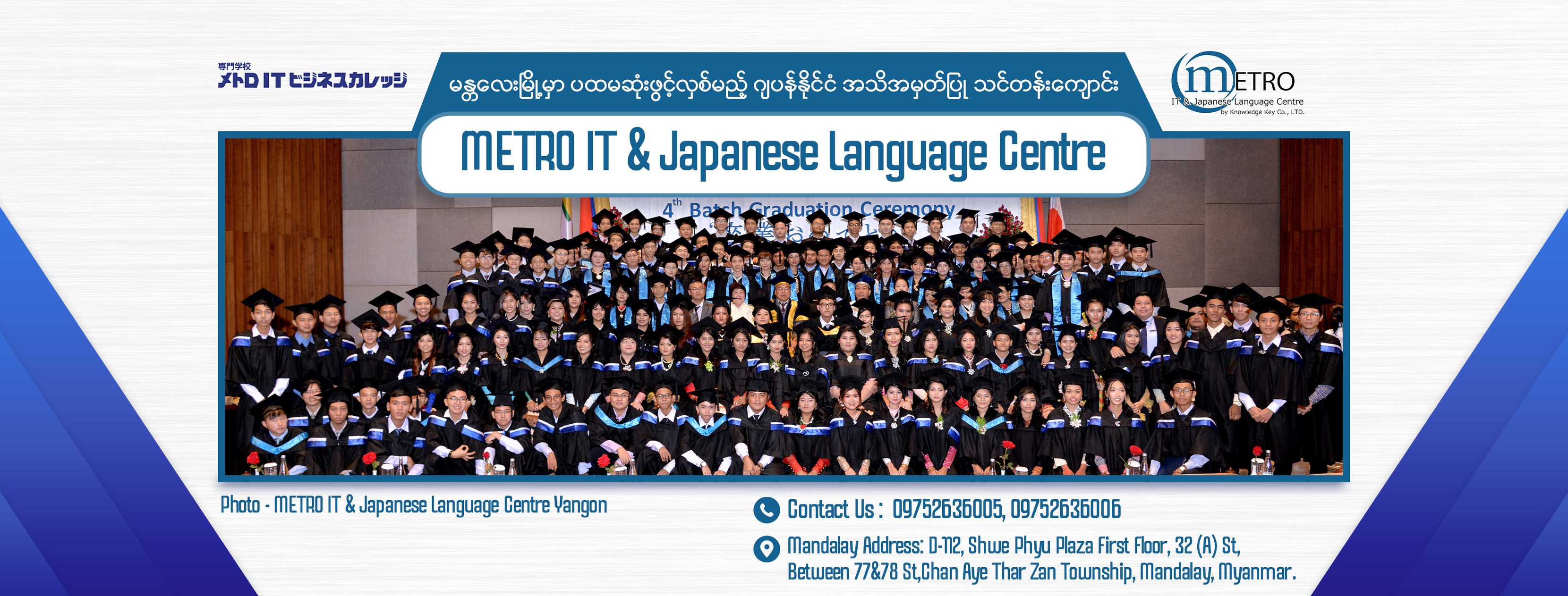 METRO IT & Japanese Language Centre by Knowledge Key Co., LTD. သင့်အနေနဲ့.... *တက္ကသိုလ်ဝင်တန်းအောင်မြင်ပြီးသူလား တက္ကသိုလ်တက်ရောက်နေဆဲလား? * GED (or) IGCSE "O" Level အောင်မြင်ပြီးသူလား? * IT ပညာကို အခြေခံမှစ လေ့လာလိုသူလား? * ပညာရေးလမ်းနှောင့်နှေးနေရလို့ အဆင်မြင့်ပညာရပ်တစ်ခုကိုသင်ယူပြီး အနာဂတ်အခွင့်အလှမ်းကောင်းများကိုရှာဖွေနေသူလား? * ဂျပန်နိုင်ငံမှာ IT ပညာရှင်အဖြစ်သွားရောက်အလုပ်လုပ်ကိုင်လိုသူလား? ဒါဆိုရင်တော့ ဂျပန်နိုင်ငံ နာဂါဆာကီမြို့မှာရှိတဲ့ METRO IT Business College ကျောင်း၏ သင်ရိုးညွှန်းတမ်းအတိုင်း Knowledge Key Co., LTD မှ တာဝန်ယူဖွင့်လှစ်သည့် Metro IT & Japanese Language Centre (မန္တလေးကျောင်းခွဲ) က သင့်ရဲ့ ပညာရေးနဲ့ အနာဂတ်အိပ်မက်တွေ လက်တွေ့ဖြစ်လာအောင် ကူညီပံ့ပိုးပေးဖို့အဆင်သင့်ပါပဲ ဂျပန် METRO IT Business College ဟာဆိုရင် Software Company တစ်ခုဖြစ်တဲ့ Metro Group ကနေ တည်ထောင်ထားတာဖြစ်ပြီး နှစ်စဉ်ထူးချွန်တဲ့နည်းပညာရှင်တွေကို မွေးထုတ်ပေးနေတဲ့ကျောင်းတစ်ကျောင်းဖြစ်ပါတယ်။ ဒီကျောင်းကြီးရဲ့ စည်းမျဉ်းစည်းကမ်းတွေအတိုင်း Metro IT & Japanese Language Centre (မန္တလေးကျောင်းခွဲ) မှာလည်း မူလသင်ရိုးနည်းစနစ်ဖြင့် (၂) နှစ်တာကာလ ပညာသင်ယူအောင်မြင်ပြီးပါက ဂျပန် METRO IT BUSINESS COLLEGE မှတိုက်ရိုက်ချီးမြှင့်တဲ့ Diploma Certificate ကို ရရှိဦးမှာဖြစ်ပါတယ်။ ဒီကျောင်းမှာ အဓိကသင်ကြားပေးမှာတွေက  အာရှနိုင်ငံ (၈)နိုင်ငံအသိအမှတ်ပြု ITPEC (ခေါ်) IT ကျွမ်းကျင်မှုစာမေးပွဲအောင်လက်မှတ် ITPEC Exam Course Certificate (IP+FE)  စီးပွါးရေးလုပ်ငန်း အဖွဲ့အစည်းတွေရဲ့ Business Manner တွေအပြင်  ဂျပန်ဘာသာစကားကိုပါ (အခမဲ့) သင်ကြားပေးတာကြောင့် တစ်နေရာတည်းမှာ ပြီးပြည့်စုံတဲ့ ကျောင်းဖြစ်ပါတယ်။