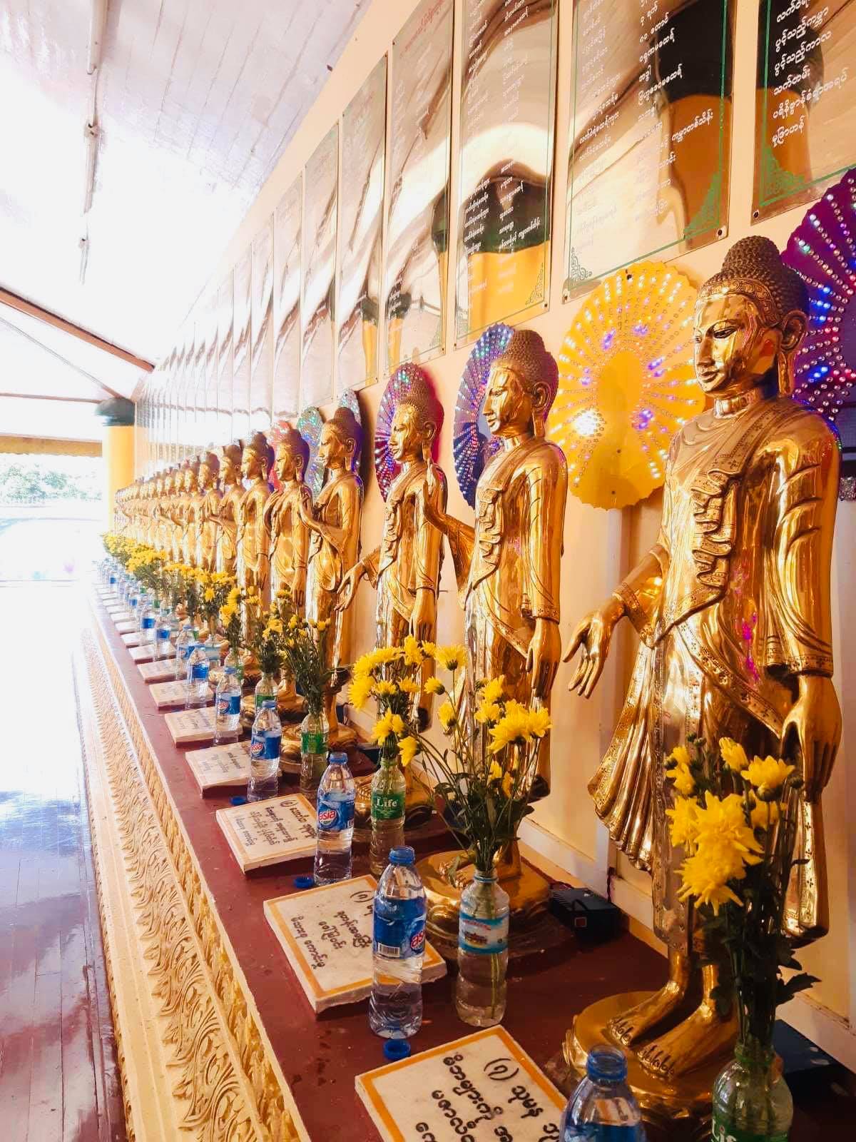 ရန်ကုန်မြို့ ရွှေတိဂုံစေတီတော်မြောက်ဘက် ဓာတ်လှေကားစောင်းတန်း မုခ်ဝအနီးရှိ ဒေါ်သင်းမြိုင်တန်ဆောင်းနံဘေးမှ လမ်းကြားကလေးခြားလျက်တွင် နှစ်ကျိပ်ရှစ်ဆူဘုရားများရှိသော ဦးခလာသီ၊ ဒေါ်ကျုံးတန်ဆောင်း ရှိ၏။ ထိုတန်ဆောင်းကို ၁၂၅၅ ခုနှစ်တွင် လှူဒါန်းခဲ့ကြောင်း ကမ္ပည်းကျောက်စာ ရှိ၏။ တန်ဆောင်းအတွင်းမှ နှစ်ကျိပ်ရှစ်ဆူ ဘုရားများကို သိင်္ဂီဦးဆရာတော်ကြီး လှရတနာဆရာတော် အမှူးပြုသော အလှူရှင်တို့က (၂၂၊ ၉၊ ၂၀၁၈) နေ့တွင် လှူဒါန်းကြောင်း ကမ္ပည်းစာ ရေးထိုးထားသည်။ နှစ်ကျိပ်ရှစ်ဆူ ဆင်းတုတော်များမှာ ရပ်တော်မူဆင်းတုများဖြစ်၍ မုဒြာဟန်အမျိုးမျိုးဖြင့် တွေ့ရသည်။ ထိုနှစ်ကျိပ်ရှစ်ဆူသော ဘုရားများ၏ ဖြစ်တော်စဉ် ဗုဒ္ဓဝင်အကျဉ်းတို့ကို ကြေးပြားများပေါ်တွင် ရေးထွင်း ဖော်ပြထားသည်။