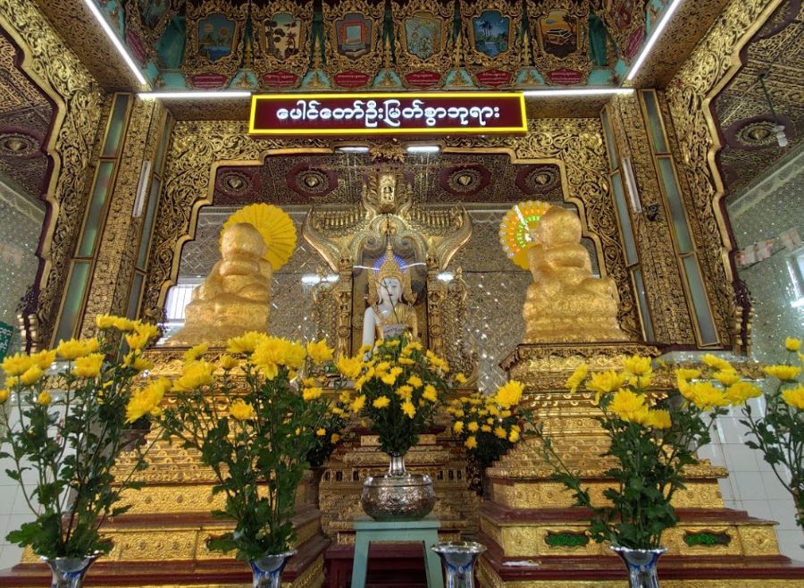 ဖောင်တော်ဦးမြတ်စွာဘုရားသည် မန္တလေးတိုင်းဒေသကြီး၊ မိုးကုတ်မြို့၊ ထင်းရှူးခြံရပ်၊ မြို့မရပ်ကွက်အတွင်း တည်ရှိပါသည်။ သက္ကရာဇ် ၄၅၀ ခုနှစ်တွင် အလောင်းစည်သူမင်းကြီးသည် သာသနာပြုရန်အတွက် သရက္ခန်အနှစ်သားဖြင့် ထုလုပ်စီရင်အပ်သော ဗုဒ္ဓရုပ်ပွားတော်မြတ်ကို ဖောင်တော်၏ဦးပိုင်းတွင် ပင့်ဆောင်၍ ပုဂံနေပြည်တော်မှ ရှမ်းပြည်နယ်သို့ရောက်ရှိလာရာ နောင်ချိုမြို့အနီး သုံးဆယ်မြို့ရှိ သီရိဓမ္မာသောကမင်းကြီး တည်ထားကိုးကွယ်ခဲ့သည့် ရွှေစံဦးစေတီတော်မြတ်၌ ဖောင်တော်ဦးတွင် ပင့်ဆောင်လာခဲ့သော သရက္ခန်ဗုဒ္ဓရုပ်ပွားတော်မြတ်တစ်ဆူကို တည်ထားပူဇော်ခဲ့သည်ဟု ဆိုပါသည်။ သက္ကရာဇ် ၁၂၅၂ ခုနှစ်တွင် ဖောင်တော်ဦးရုပ်ပွားတော်မြတ်ကို သုံးဆယ်မြို့မှ မိုးကုတ်မြို့သို့ ပင့်ဆောင်ပြီး ဈေးကျောင်းတိုက်တွင် ပူဇော်ခံထားရှိရာတွင် ဈေးကျောင်းတိုက်၌ လာရောက်ဖူးမြော်သူများပြားလှပြီး ကျောင်းကြီးမှာလည်း အိုဟောင်းပျက်စီးနေသဖြင့် တောင်ရွာကျောင်းကြီးသို့ ပြောင်းရွှေ့ပူဇော်ခဲ့ပါသည်။ တောင်ရွာကျောင်းကြီးသို့ ရောက်သောအခါ ဘုရားဒါယကာကြီး ဦးရွှေလှိုင်းက အာရုဏ်ခံကျောင်းဆောင်နှင့်တကွ မူလအရွယ်လက်လေးသစ်ခန့်ရှိသည့် အလောင်းစည်သူ မင်းကြီး၏ သရက္ခန်နံ့သာနှစ်ဗုဒ္ဓရုပ်ပွားတော်ထက်ကြီးသော ဉာဏ်တော် ၁၈ လက်မခန့်ရှိသည့် ဖောင်တော်ဦးဗုဒ္ဓရုပ်ပွားတော် ပုံတူတစ်ဆူကို ကျောက်မျက်ရတနာများ ဌာပနလျက် ထပ်မံပြုလုပ်လှူဒါန်းပါသည်။ ထိုအခါမှစ၍ ရုပ်ပွားတော်အသေးတစ်ဆူ၊ အကြီးတစ်ဆူ ပေါင်း ၂ ဆူဖြစ်လာရ ပါသည်။ ၁၂၅၆ ခုနှစ်တွင် တောင်ရွာကျောင်းကြီးမှ မိုးကုတ်မြို့အရှေ့ပိုင်း မုံတောအရပ်သို့ ပြောင်းရွှေ့စမ္ပါယ်တော်မူရပါသည်။ ထိုအခါတွင် ဘုရားဒါယကာကြီး ဦးမှိုင်းက ဗုဒ္ဓရုပ်ပွားတော်နှစ်ဆူဉာဏ်တော်ညီတူဖြစ်စေရန် ဉာဏ်တော် ၁၈ လက်မခန့်ရှိ ဗုဒ္ဓရုပ်ပွားတော် တစ်ဆူထပ်မံပြုလုပ်၍ ထိုရုပ်ပွားတော်အတွင်း၌ အလောင်းစည်သူမင်းကြီး၏ သရက္ခန်နံ့သာနှစ် ဗုဒ္ဓရုပ်ပွားတော်မြတ်နှင့်တကွ ရွှေ၊ ငွေ၊ ကျောက်မျက်ရတနာမျိုးစုံတို့ကို ထည့်သွင်းဌာပနာ ပူဇော်ပါသည်။ ဤအချိန်မှစ၍ ရုပ်ပွားတော်နှစ်ဆူ ညီတူဖြစ်လာရပါသည်။ ၁၂၆၇ ခုနှစ်၊ တန်ဆောင်မုန်းလဆန်း ၈ ရက်နေ့တွင် အင်္ဂလိပ်ကျောက်တွင်းကုမ္ပဏီက ကျောက်တွင်းလုပ်ငန်းနယ်မြေမလွတ်သဖြင့် မုံတောအရပ်မှအရှေ့ဘက် နန့်ကောင်တောင်ခြေ (ယခုပိတ်စွယ်ဘုရားငါးဆူတောင်ခြေ)သို့ ပြောင်းရွှေ့ကိုးကွယ်ပူဇော်ရန် စီစဉ်တည်ဆောက်ပေးပြီး ထိုကျောင်းတော်ကြီးကို မုံတောကျောင်းဟုခေါ်တွင်ကြပါသည်။ ၎င်းနောက် ဒုတိယကမ္ဘာစစ်အတွင်း မဟာမိတ်လေယာဉ်ပျံများ ဗုံးကျဲသဖြင့် ဂန္ဓကုဋိတိုက်တော်ကြီးကို မီးလောင်နေစဉ် မိုးကုတ်မြို့အရှ