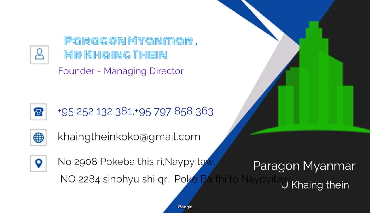 : အမှတ်(၂၂၈၄)၊ နှင်းဆီလမ်း၊ Block 2, တပင်ရွှေထီးရပ်ကွက်၊ ပုဗ္ဗသီရိမြို့နယ်၊ နေပြည်တော်။