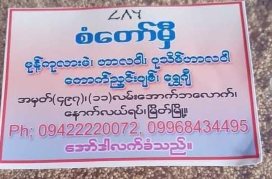 : အမှတ်(၄၉၇)၊ (၁၁)လမ်းအောက်ဘလောက်၊ နောက်လယ်ရပ်၊မြိတ်မြို့၊ တနင်္သာရီတိုင်းဒေသကြီး။