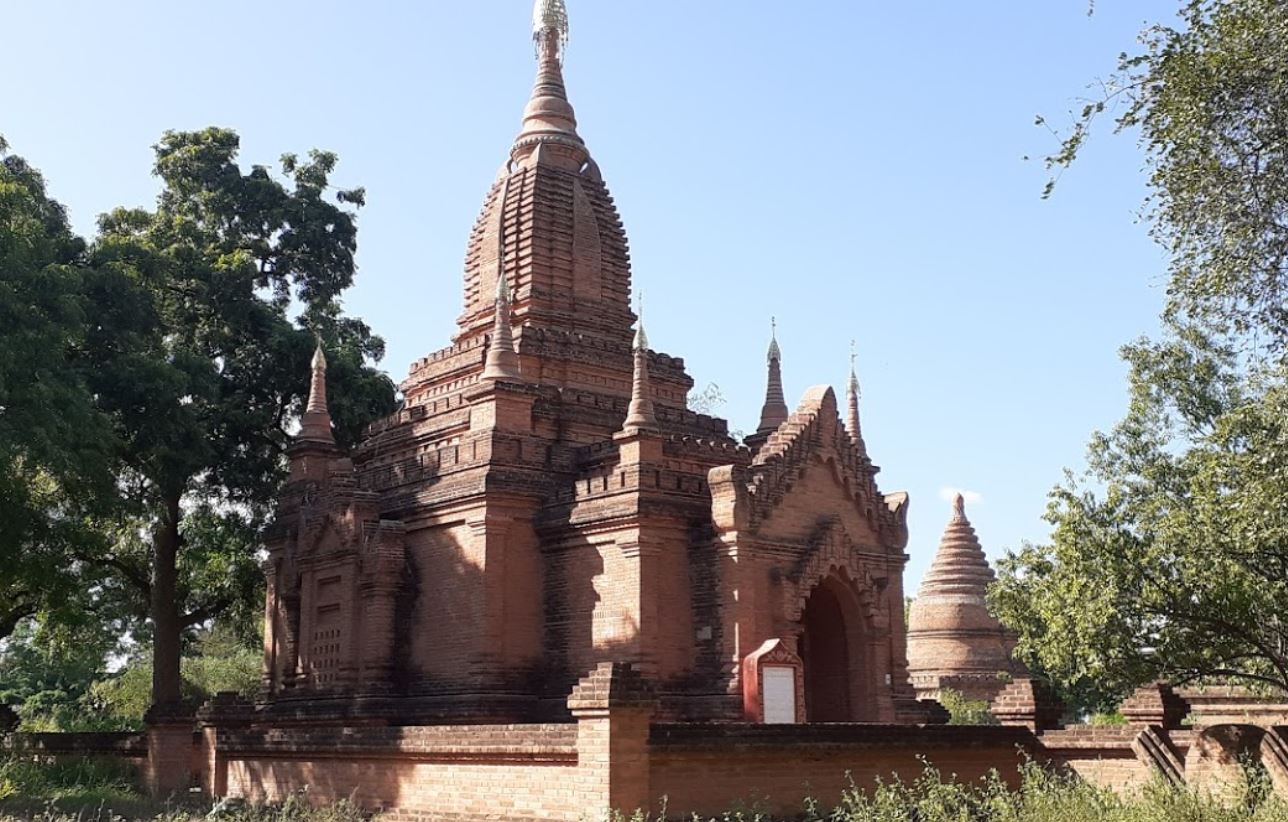 ရွှေထီးဆောင်းဘုရားသည် မန္တလေးတိုင်ဒေသကြီး၊ ညောင်ဦးမြို့နယ်၊ ပုဂံမြို့ဟောင်း၊ မဟာဗောဓိစေတီတော်၏ မြောက်ဘက်အနီးတွင် တည်ရှိပါသည်။ အရှေ့ဘက်မုခ်လှည့် တစ်ထပ်ဂူ ကွမ်းတောင်ပေါက် ဂူဘုရားလတ်တစ်ဆူဖြစ်ပြီး ကျန်စစ်သား ထီးလှိုင်မင်းအဖြစ် ရွှေထီးဆောင်းစဉ်ကာလက တည်ထားခဲ့သည်ဟု ဆိုပါသည်။ ဂူအတွင်းအလယ်၌ ရုပ်ပွားဆင်းတုတော်ကြီးတစ်ဆူနှင့် နံရံဆေးရေးပန်းချီလက်ရာများ ကျန်ရှိပါသည်။ အပြင် အဝင်မုခ်တံကဲကြီးနှင့် ပြတင်းမုခ်တံကဲတို့တွင် အင်္ဂတေပန်းကြွများ ရှေးမူအတိုင်း ကြည့်ရှုစရာလက်ရာအချို့ ကျန်ရှိနေပါသည်။