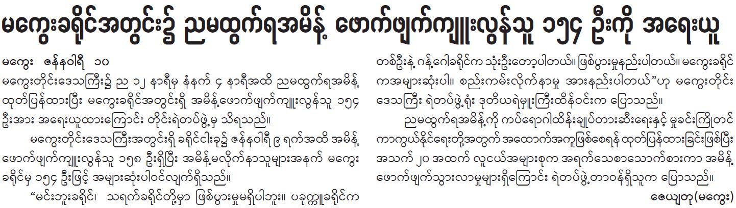 မကွေးတိုင်းဒေသကြီးအတွင်းရှိ ခရိုင်ငါးခု၌ ဇန်နဝါရီ ၉ ရက်အထိ အမိန့် ဖောက်ဖျက်ကျူးလွန်သူ ၁၅၈ ဦးရှိပြီး အမိန့်မလိုက်နာသူများအနက် မကွေး ခရိုင်မှ ၁၅၄ ဦးဖြင့် အများဆုံးပါဝင်လျက်ရှိသည်။
