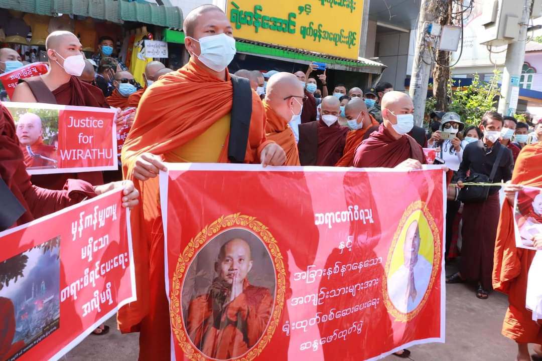 နိုင်ငံတော်အကြည်ညိုပျက်စေမှု ပုဒ်မ ၁၂၄ (က) နဲ့ တရားရင်ဆိုင်နေရတဲ့ ဆရာတော် ဦးဝီရသူကို တရားရုံးမှာ ရုံးထုတ်စစ်ဆေးပေးဖို့ဆိုပြီး သံဃာတော်တွေ အပါအဝင် အမျိုးသားရေး တက်ကြွလှုပ်ရှားသူ အယောက် ၂၀ ကျော်တို့ဟာ ရန်ကုန်အင်းစိန်အကျဉ်းထောင်ရှေ့မှာ ဒီနေ့ မနက်က ဆန္ဒပြတောင်းဆိုကြပါတယ်။