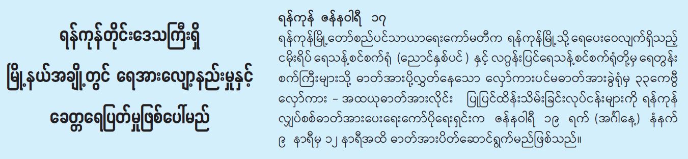 ရန်ကုန်မြို့တော်စည်ပင်သာယာရေးကော်မတီက ရန်ကုန်မြို့သို့ ရေပေးဝေလျက်ရှိသည့် ငမိုးရိပ် ရေသန့်စင်စက်ရုံ (ညောင်နှစ်ပင်) နှင့် လဂွန်းပြင်ရေသန့်စင်စက်ရုံတို့မှ ရေတွန်း စက်ကြီးများသို့ ဓာတ်အားပို့လွှတ်နေသော လှော်ကားပင်မဓာတ်အားခွဲရုံမှ ၃၃ကေဗွီ လှော်ကား - အထယုဓာတ်အားလိုင်း ပြုပြင်ထိန်းသိမ်းခြင်းလုပ်ငန်းများကို ရန်ကုန် လျှပ်စစ်ဓာတ်အားပေးရေးကော်ပိုရေးရှင်းက ဇန်နဝါရီ ၁၉ ရက် (အင်္ဂါနေ့) နံနက် ၉ နာရီမှ ၁၂ နာရီအထိ ဓာတ်အားပိတ်ဆောင်ရွက်မည်ဖြစ်သည်။