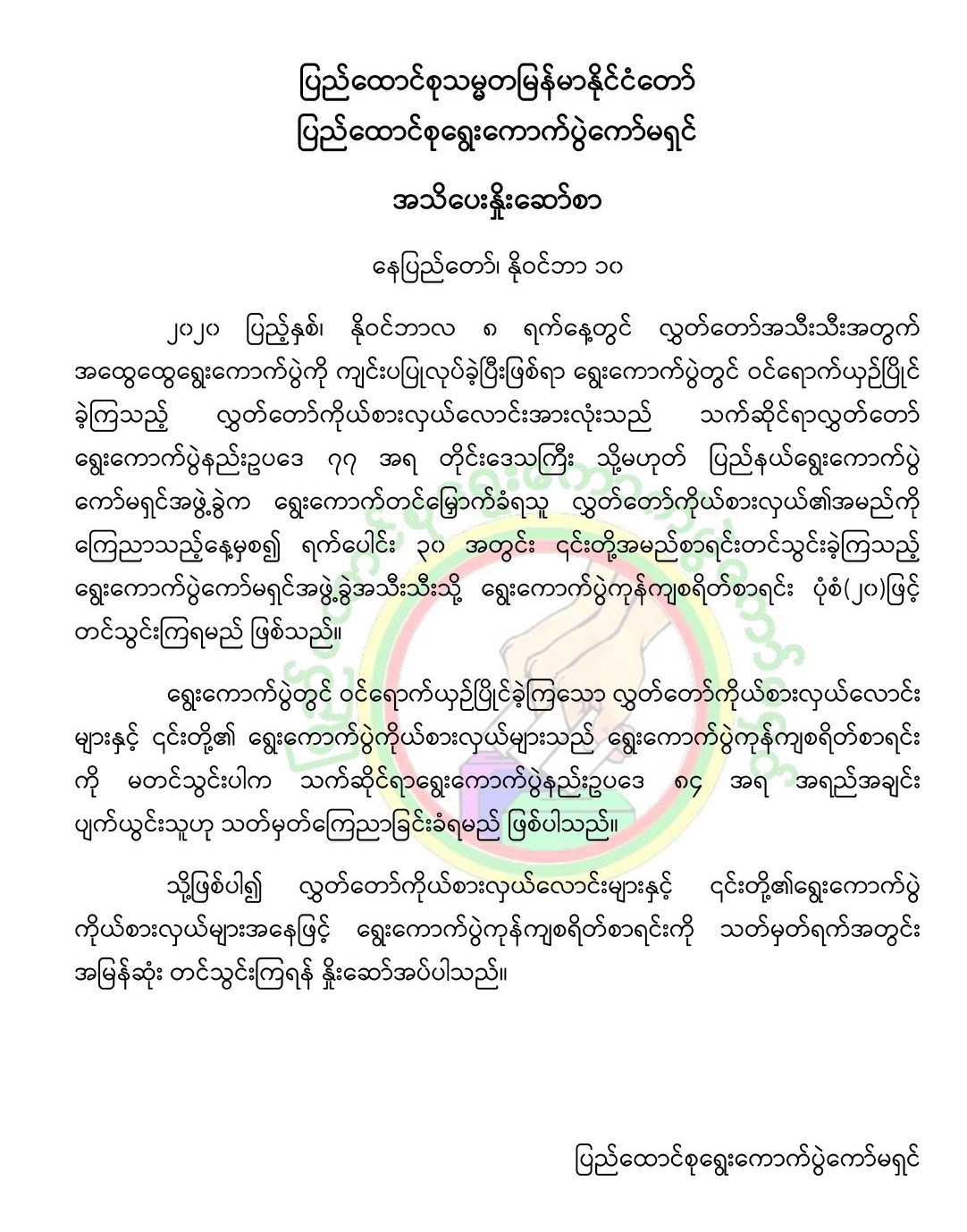 ရွေးကောက်ပွဲကုန်ကျစရိတ်စာရင်းကို သတ်မှတ်ရက်အတွင်း အမြန်ဆုံးတင်သွင်းကြရန် ထပ်မံအသိပေးနှိုးဆော်