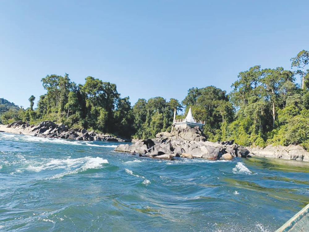 နတ်ကျွန်းသို့ ကချင်ပြည်နယ် မချမ်းဘေ့ာမြို့ နောင်ခိုင်ရွာမှတစ်ဆင့် မလိခမြစ်အတိုင်း စက်လှေဖြင့် မိနစ် ၂၀ ခန့် စုန်ဆင်းသွားရောက်နိုင်ပါသည်။ မလိခမြစ်လယ်တွင်တည်ရှိသော နတ်ကျွန်းတွင် ကျောက်တုံးကြီးပေါ်၌ တည်ထားသော စေတီတော်တစ်ဆူ တည်ရှိပါသည်။ ၂၀၁၄ ခုနှစ်တွင် မချမ်းဘောမြို့ နောင်ခိုင်ကျေးရွာ နောင်ခိုင်ဆရာတော် ဦးဆောင်ကာ စေတနာရှင်များ၏ စုပေါင်းလှူဒါန်းမှုဖြင့် တည်ထားပြီး စေတီတော်ကို စူဠာမဏိဖားကိုပ်လောင်းစေတီတော် (ခေါ်) နတ်ကျွန်းစေတီတော်ဟု ခေါ်ဝေါ်ခဲ့ကြပါသည်။ နတ်တို့ ဖန်ဆင်းထားသည်ဟု ပါးစပ်ရာဇဝင်အဆိုရှိကြသော မလိခမြစ်ထဲရှိ နတ်ကျွန်းသည် ရေခဲမြစ် Glacier များ မြေပြန့်လွင်ပြင်ထဲသို့ ဖြတ်စီးဆင်းရာမှ အောက်ခြေ ချော်ကျောက်တုံးများ၊ မီးသင့်ကျောက်များ တိုက်စားပို့ချပြီး မြစ်ကြောင်းအဝကျယ် ရေငြိမ်သည့်နေရာတွင် ပုံစံဆန်းပြားသော ကျောက်တုံးများ စုပြုရာမှ ဖြစ်ပေါ်လာသော သဘာဝကျွန်းတစ်ခုဖြစ်ပါသည်။ နတ်ကျွန်းသည် နတ်များ ဖန်ဆင်းထားသည့်အလား ကျောက်တုံးကျောက်ဆောင်များမှာ ထူးခြားဆန်းပြားလျက်ရှိသည့် သာယာလှပသည့် ကျွန်းဖြစ်ပါသည်။