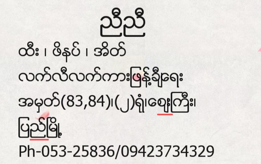 : အမှတ်(၈၃၊၈၄)၊ (၂)ရုံ၊ ဈေးကြီး၊ ပြည်မြို့၊ ပဲခူးတိုင်းဒေသကြီး။