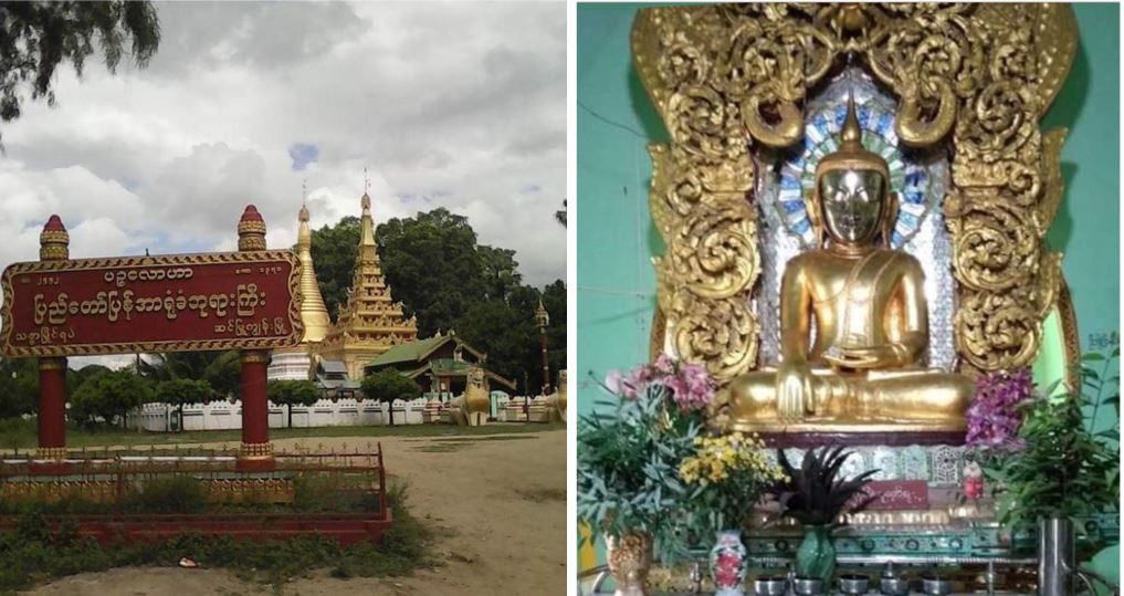 မကွေးတိုင်းဒေသကြီး၊ ဆင်ဖြူကျွန်းမြို့၊ သစ္စာမြိုင်ရပ်ကွက်၊ မင်ဘူး-ဆင်ဖြူကျွန်းသွားကားလမ်းမကြီး အနောက်ဘက်တွင် တည်ရှိသည်။ ဘိုးတော်ဗဒုံမင်းလက်ထက်တွင် မယ်ပွေးတို့ဇနီးမောင်နှံသည် လယ်ယာလုပ်ကိုင်ရင်း လယ်ထဲမှ ရွှေငွေရတနာများ အများအပြား တွေ့ရှိခဲ့ရာ ဘိုးတော်ဘုရားထံ ဆက်သခဲ့ရာ ဘိုးတော်ဘုရားက ၎င်းတို့ဇနီးမောင်နှံ၏ ရိုးသားမှုကို ဂုဏ်ပြုသည့်အနေဖြင့် ရွှေငွေရတနာများကို ပြန်လည်ပေးအပ်သည့်အပြင် သူကြွယ်ဘွဲ့ပေးအပ်ခဲ့ပြီး ရွှေ၊ ငွေ၊ ကြေး၊ သံ တို့ကို ပေါင်းစပ်၍ သွန်းလောင်းထားသော ပဉ္စလောဟာရုပ်ပွားတော်မြတ်ကြီးကိုလည်း ကိုးကွယ်ပူဇော်ရန် ပေးအပ်ချီးမြှင့်ခဲ့ပါသည်။ မယ်ပွေးသည် ဘုရင်မင်းတရားပေးအပ်လိုက်သော ပဉ္စလောဟာဆင်းတုတော်ကြီးကို ငွေစင်ပိဿာ ၃၀ အကုန်အကျခံကာ ဘုရားစေတီတည်ထားကိုးကွယ်ပြီး "ပဉ္စလောဟာအာရုံခံဘုရားကြီး" ဟု ဘွဲ့အမည်ခေါ်တွင်ခဲ့ပါသည်။ ၁၉၉၀ ခုနှစ်တွင် ဆင်းတုတော်ကြီး၏ ဦးခေါင်းတော်ဖြတ်၍ အခိုးခံခဲ့ရပြီး ထိုင်းနိုင်ငံ မယ်ဆောက် (မဲဆောက်)ဒေသတွင် ပြန်လည်တွေ့ရှိခဲ့ကြကာ မူလဒေသ ဆင်ဖြူကျွန်းမြို့သို့ ပြန်လည်ပင့်ဆောင်ပူဇော်နိုင်ခဲ့ပါသည်။ ပြည်ပနိုင်ငံမှ ပြန်လည်ကြွရောက်လာသော ဘုရားဖြစ်သဖြင့် မူလဘွဲ့အမည် "ပဉ္စလောဟာအာရုံခံဘုရားကြီး" မှ "ပဉ္စလောဟာပြည်တော်ပြန်အာရုံခံဘုရားကြီး" ဘွဲ့အမည် ခေါ်တွင်ခဲ့ကြပါသည်။