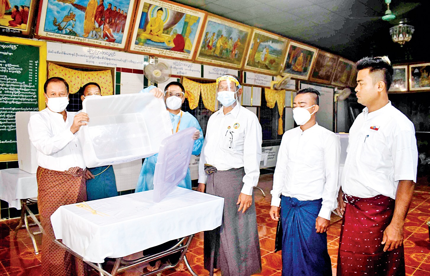 ထို့နောက် မဲဆန္ဒရှင်ပြည်သူများအား ကျန်းမာရေးနှင့် အားကစားဝန်ကြီးဌာန၏ ညွှန်ကြားချက်များနှင့် အညီ ကိုယ်အပူချိန် တိုင်းတာခြင်း၊ လက်သန့်ဆေးရည်ဖျန်းခြင်း၊ ပါးစပ်နှင့် နှာခေါင်းစည်းများ အသစ်လဲလှယ် ပေးခြင်း၊ မဲစာရင်းစစ်ဆေးခြင်း၊ မဲလက်မှတ် ထုတ်ပေးခြင်း၊ မဲထည့်ခြင်း၊ မဲထည့်ပြီးကြောင်း အမှတ်အသားအဖြစ် လက်သန်းတွင် မင်တို့ခြင်းများကို စနစ်တကျ ဆောင်ရွက် ပေးလျက်ရှိပြီး ဆန္ဒမဲပေးခွင့်ရှိသူ ပြည်သူများ ကလည်း မိမိတို့၏ဆန္ဒအလျောက် လွတ်လပ် စွာ ဆန္ဒမဲပေးလျက်ရှိသည်။