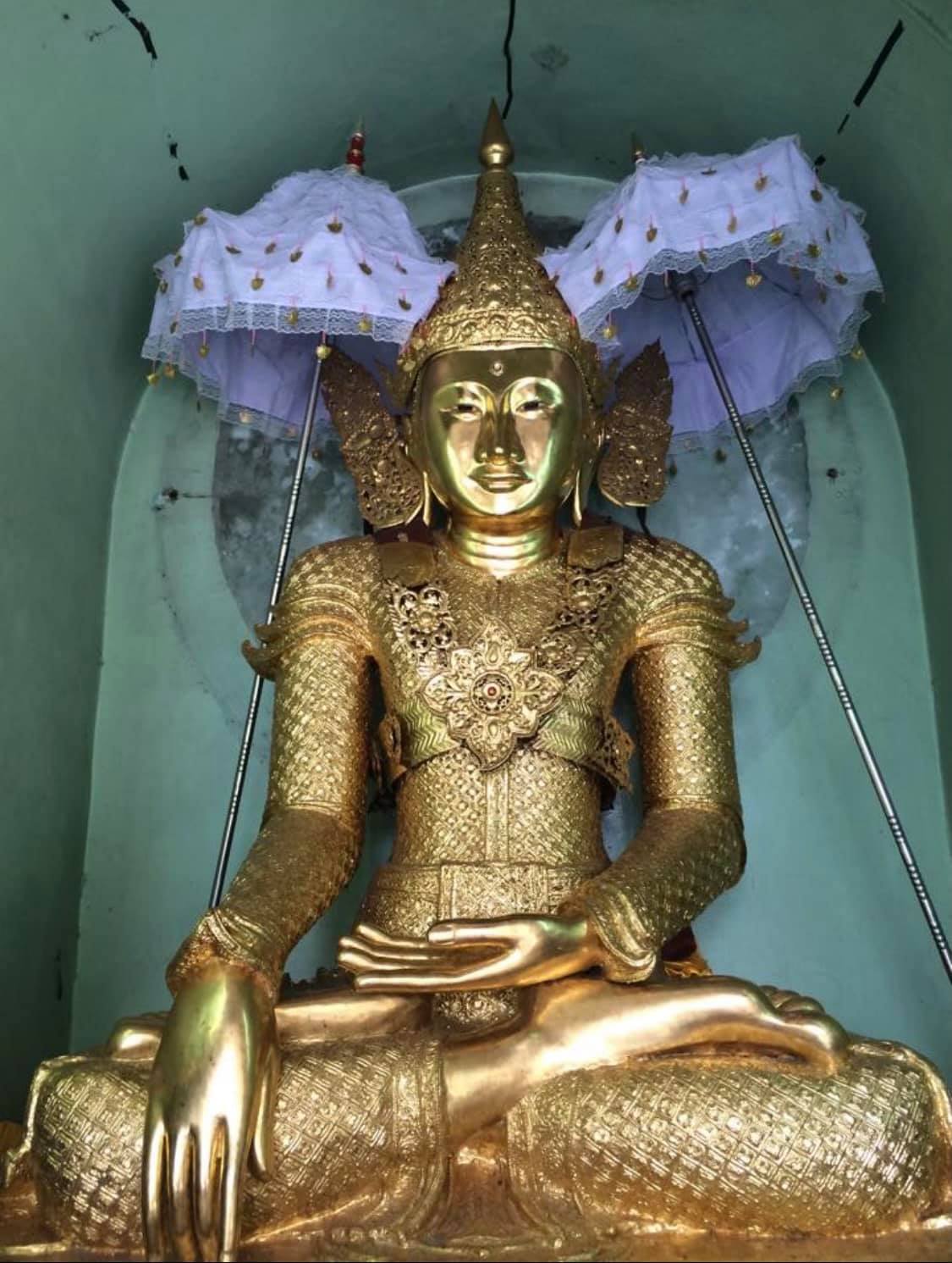 ရန်ကုန်မြို့ ရွှေတိဂုံစေတီတော်အနီး နောင်တော်ကြီးစေတီ၏ အနောက်မြောက်ထောင့်ရှိ အုတ်ဖြူစေတီ လိုဏ်မုခ်အတွင်း ရာဇမုနိအဓိဋ္ဌာန်ဘုရား သီတင်းသုံးသည်။ စောလဖော်စေတီ၏ အရှေ့ဘက်တွင် တည်ရှိသော လိုဏ်မုခ်ခံ စေတီငယ်ကလေး ဖြစ်သည်။ ထိုစေတီကို ရှေးအခါက 'ပန်းပေါင်းစေတီ' ဟု ခေါ်ကြသည်။ စေတီ၏ လိုဏ်မုခ်အတွင်းမှ ရာဇမုနိရုပ်ပွားတော်မှာ ညောင်ရမ်းမင်းသား ဗုဒ္ဓဂါယာမှ ယူဆောင်လာသော ဗောဓိသားဖြင့် ထုလုပ်သည်ဟု ဆိုကြသည်။ မကိုဋ်စလွယ် မင်းမြောက်တန်ဆာ ဆင်ယင်သော ဇမ္ဗုပတိပုံတော် ရွှေပိန်းချ ဆင်းတုဖြစ်သည်။ ထိုရုပ်ပွားတော်ကို ရှေးယခင်က ပန်းပေါင်းကိုယ်တော်ဟု ခေါ်ကြသည်။ အရှေ့ရင်ပြင် အင်းစေတီအနီးမှ ဘိုးဘိုးအောင် ဆုတောင်းပြည့်ဘုရားသည်လည်း ပန်းပေါင်းဆင်းတု ဟုပင် အမည်ရှိသဖြင့် ဘွဲ့မည်တော်ချင်း တူသည်။ ရာဇမုနိဘုရားတွင် မင်းစိုးရာဇာနှင့် ပတ်သက်သော ကိစ္စများအတွက် လာရောက်ပူဇော် အဓိဋ္ဌာန်ကြသည်။