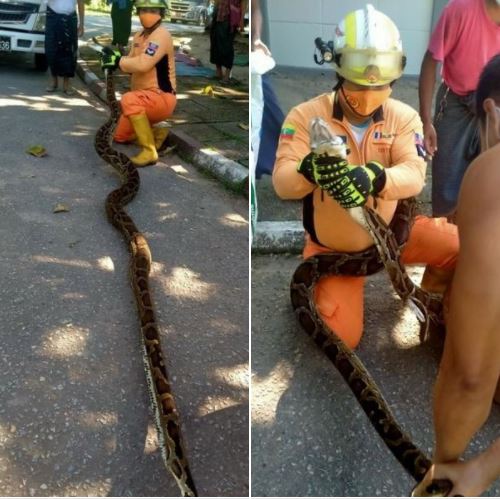 ဒီနေ့ နိုဝင်ဘာ ၁၇ ရက် မနက်ပိုင်းမှာ လမ်းသွားလမ်းလာတွေက ဒီမြွေကြီးကိုတွေ့လို့ ဖမ်းဆီးပေးဖို့ မီးသတ်တပ်ဖွဲ့ကို အကူအညီတောင်းခံခဲ့တာဖြစ်ပါတယ်။