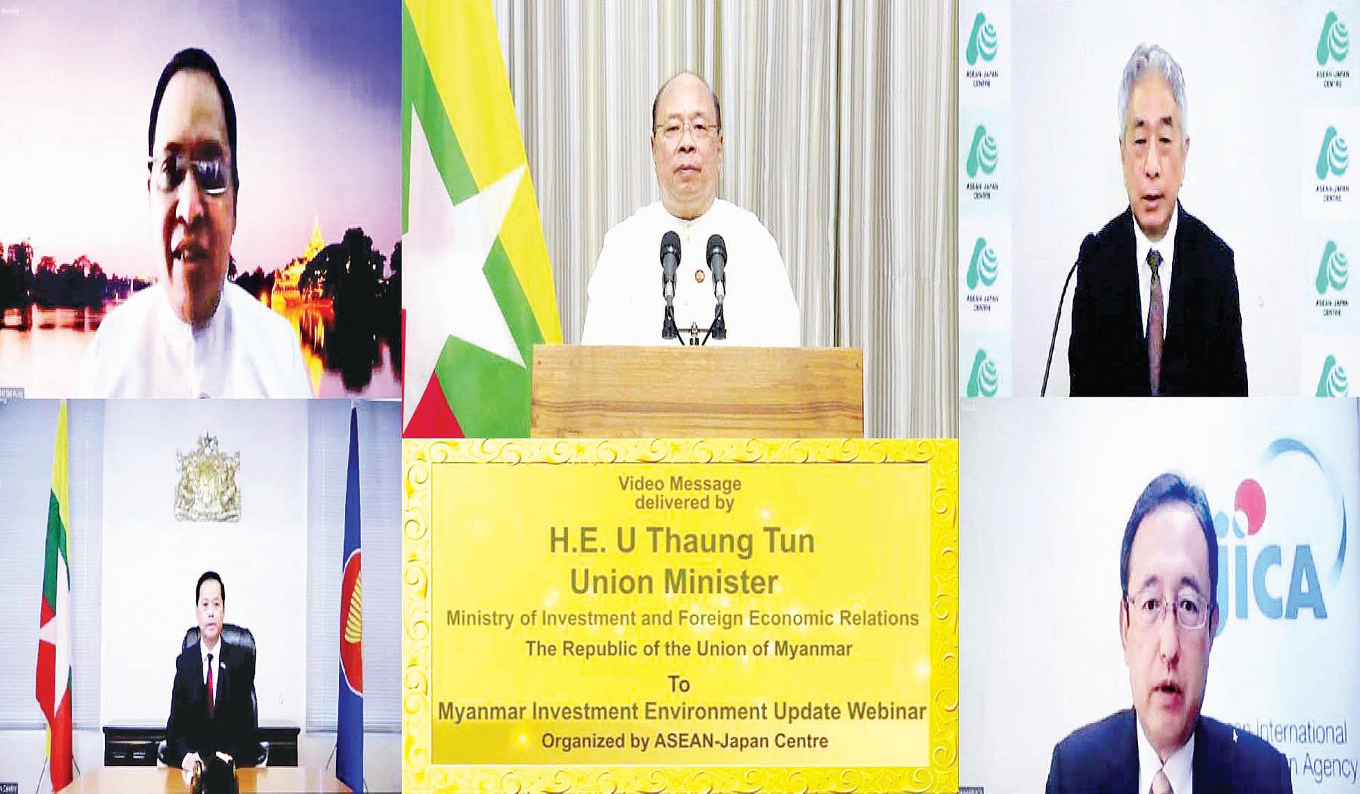 ရင်းနှီးမြှုပ်နှံမှုနှင့် နိုင်ငံခြားစီးပွားဆက်သွယ်ရေးဝန်ကြီးဌာနနှင့် ဂျပန်အပြည်ပြည်ဆိုင်ရာ ပူးပေါင်းဆောင်ရွက်ရေး အေဂျင်စီတို့၏ ကူညီပံ့ပိုးမှု၊ အာဆီယံ-ဂျပန်စင်တာနှင့် မြန်မာသံရုံး (တိုကျိုမြို့)တို့၏ ပူးပေါင်းဆောင်ရွက်မှုတို့ဖြင့် Myanmar Investment Environment Update Webinar ကို ယနေ့နံနက်ပိုင်းတွင် ဂျပန်နိုင်ငံ၌ Virtual စနစ်ဖြင့် ကျင်းပရာ မြန်မာနိုင်ငံ ရင်းနှီးမြှုပ်နှံမှုကော်မရှင်ဥက္ကဋ္ဌ၊ ရင်းနှီးမြှုပ်နှံမှုနှင့် နိုင်ငံခြားစီးပွားဆက်သွယ်ရေးဝန်ကြီးဌာန ပြည်ထောင်စုဝန်ကြီး ဦးသောင်းထွန်းက Video Message ပေးပို့သည်။