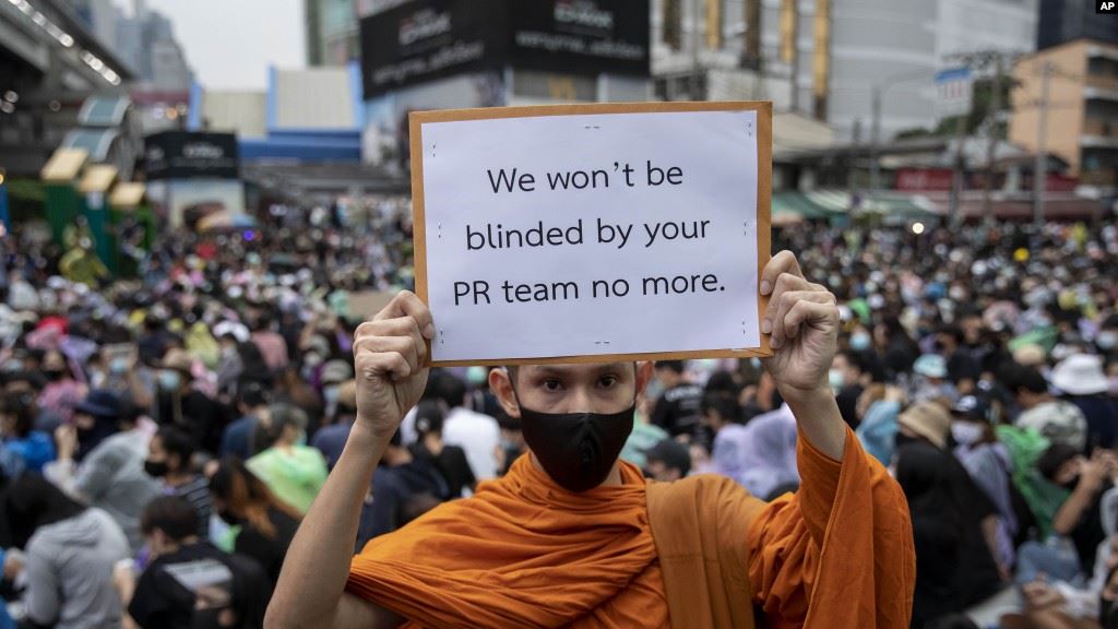လတ်တလော ထိုင်းဒီမိုကရေစီရေး လှုပ်ရှားမှု ဆန္ဒပြပွဲတွေမှာ ထိုင်းဘုန်းတော်ကြီးတွေ ကျယ်ကျယ်ပြန့်ပြန့် ပါဝင်တာမျိုး မရှိသေးပေမယ့် ဆန္ဒပြ လူအုပ်ကြားထဲမှာတော့ သင်္ကန်းဝတ်တွေကို တွေ့လာရပါတယ်။ ဆန္ဒပြပွဲ ၃ ခုလောက်မှာ ပါဝင်ခဲ့တဲ့ သက်တော် ၂၁ အရွယ် ဦးပဇင်း Chistnupong Praiparee ကတော့ သံဃာအများစုရဲ့သဘောထားကို ပြသနိုင်ဖို့ ဆန္ဒပြပွဲတွေမှာ ဆက်လက် ပါဝင်သွားမယ်လို့ မိန့်ပါတယ်။ ဒါ့အပြင် ထိုင်းနိုင်ငံရဲ့ နိုင်ငံတော်သံဃာ့ မဟာနာယကအဖွဲ့ကိုလည်း ပြုပြင်ပြောင်းလဲရေး လုပ်ဖို့ ဆန္ဒပြပွဲတွေမှာ ထည့်သ ွင်း တောင်းဆို သွားမယ်လို့ ဆိုပါတယ်။
