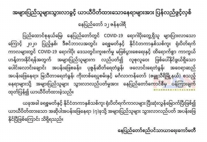 ယာယီပိတ်ထားသောနေရာများသို့ သွားရောက်လည်ပတ်အပန်းဖြေနိုင်ပြီ